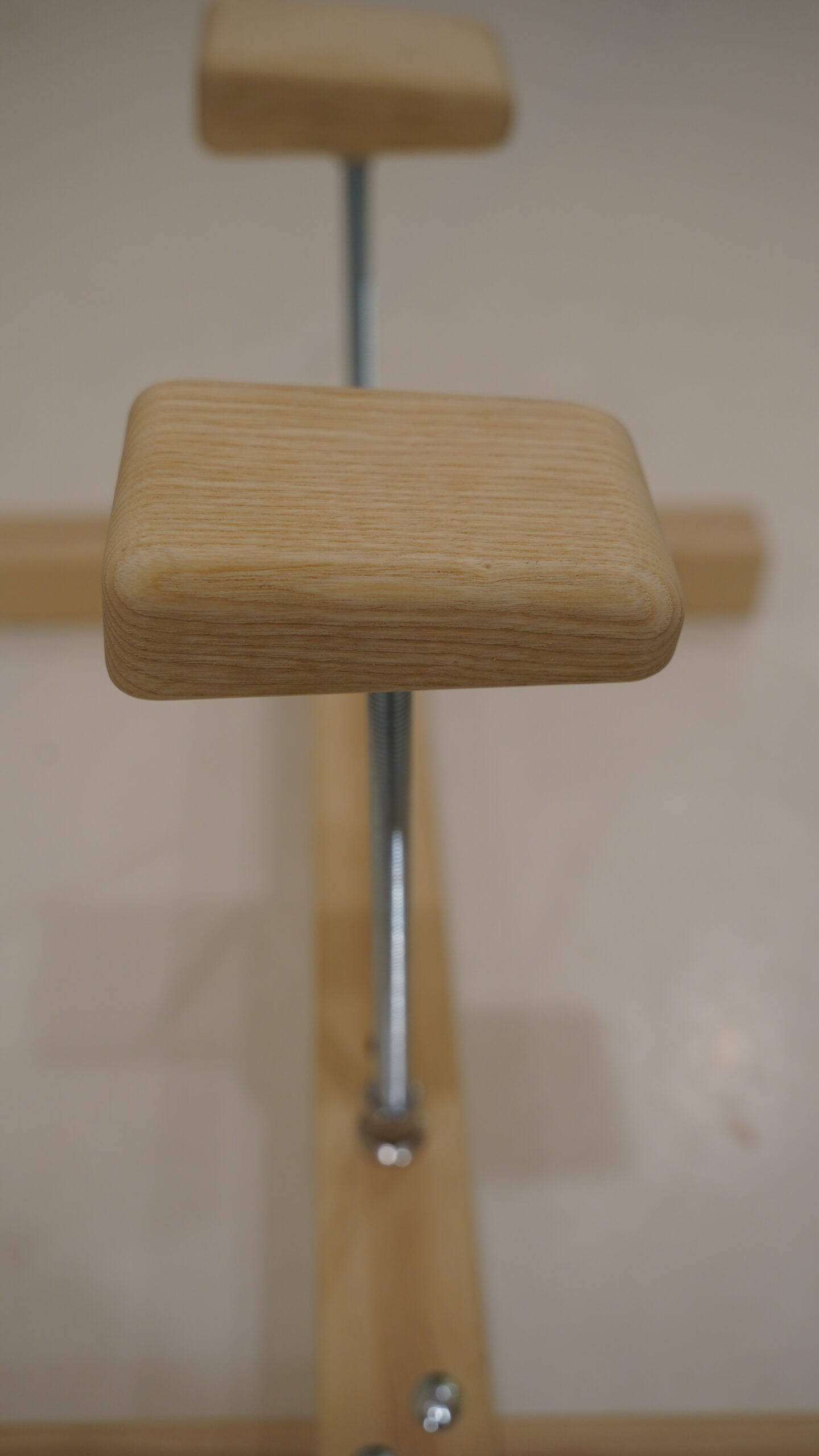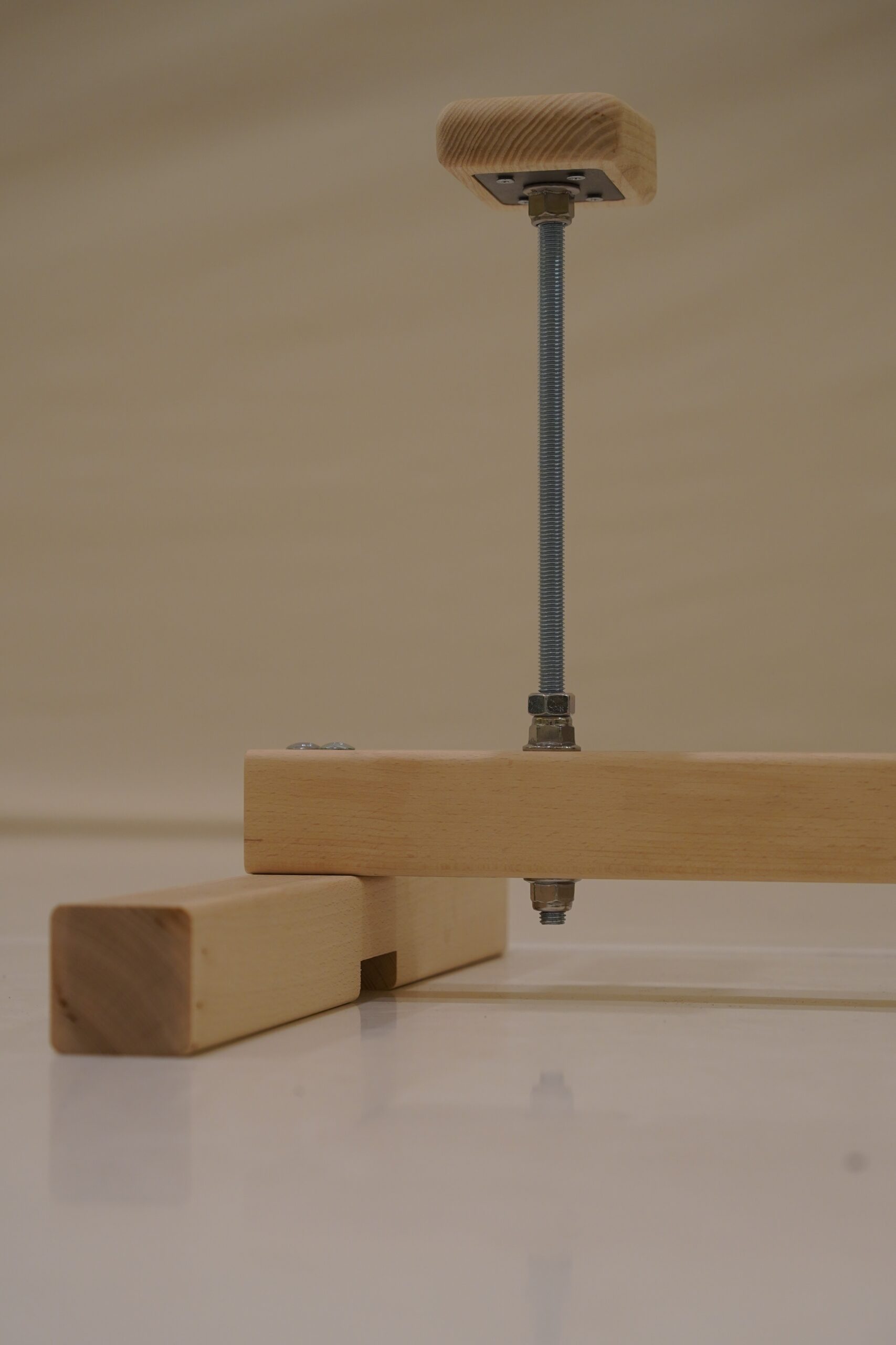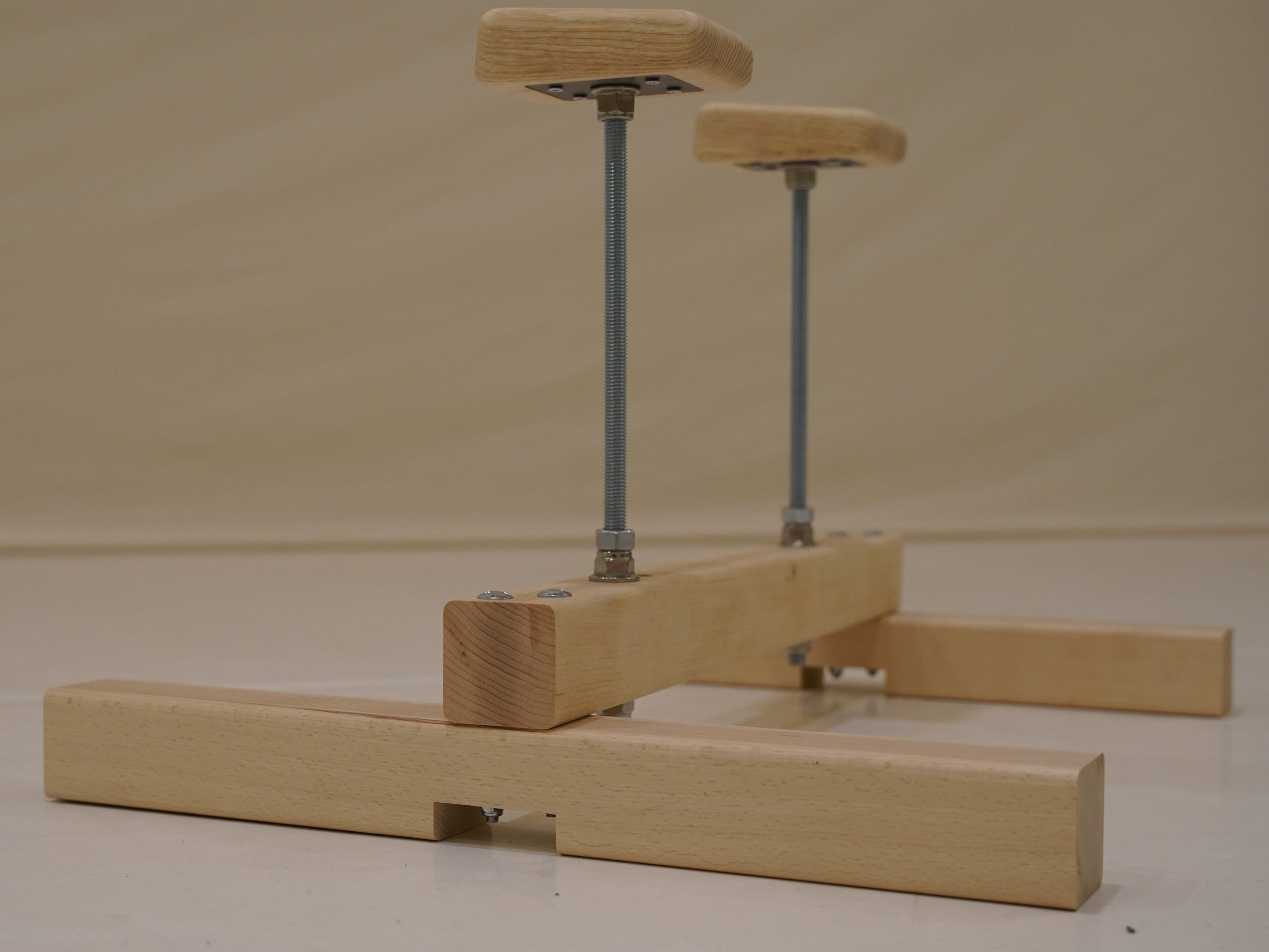 Das Set kommt als Bausatz mit Videoanleitung. Das meiste Werkzeug ist bereits. Zusätzlich werden ein Akkuschrauber und ein Hammer benötigt. Die hochwertige Basis aus Buchenholz sowie die Griffe aus Esche kommen fertig gefräst. Die Stange ist bereits mit rotationsgesicherten Muttern vormontiert. Über die vorhandenen Löcher kann die Schulterbreite auf 270 mm, 305 mm oder 340 mm eingestellt werden.